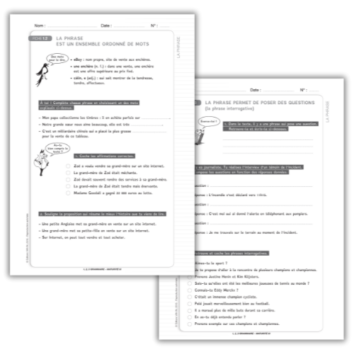 - Les catégories de la grammaire (phrase, groupe de mots, nature des mots…) sont abordées et travaillées au travers des différentes fiches.