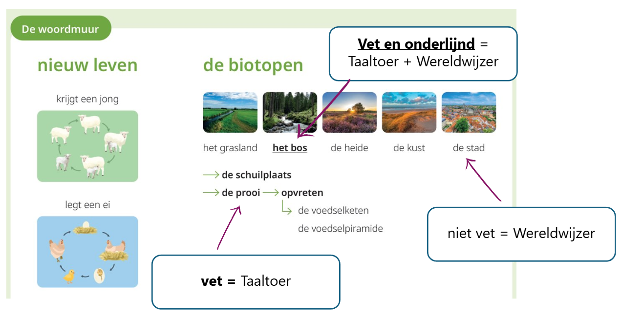Woorden in het vet komen uit Taaltoer, niet vet uit Wereldwijzer en vet en onderlijnd zijn gedeeld.
