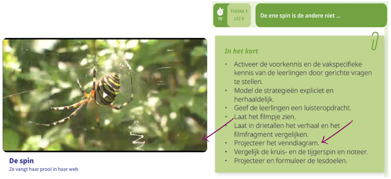 Ze vergelijken de wespspin en de kruisspin en brengen hun bevindingen samen in een venndiagram via de bordles. Tegelijk leren en gebruiken ze nieuwe woorden zoals de prooi en opvreten.
