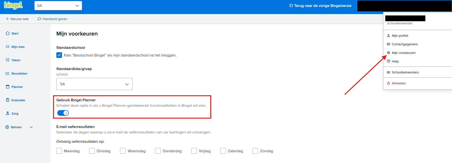 Het is daarbij belangrijk dat je bij ‘mijn voorkeuren’ de schakelaar ‘Gebruik Bingel Planner’ hebt aangevinkt.