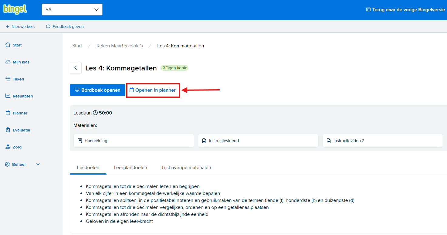 1 Klik in Bingel Planner op "Leermiddelen".