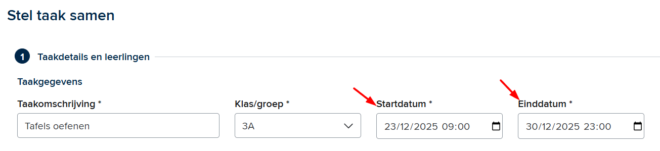 Kies best niet vandaag als startdatum want als één leerling de taak start, kun je niets meer wijzigen.