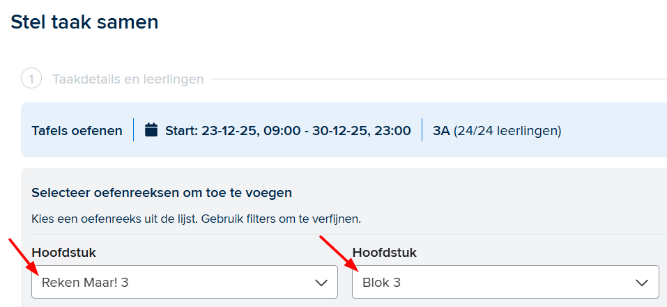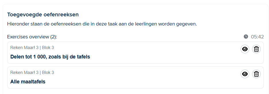 De taak is nu met succes samengesteld. De leerlingen ontvangen de taak automatisch op hun startscherm. Door te klikken op de taak zien de leerlingen meteen de oefenreeksen die ze moeten maken.