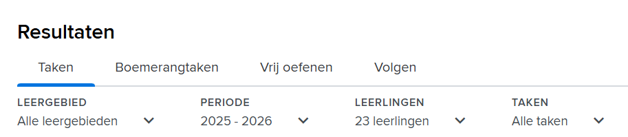 3 Klik op een tab bv. "Taken" en gebruik de filter om gerichter resultaten op te roepen.