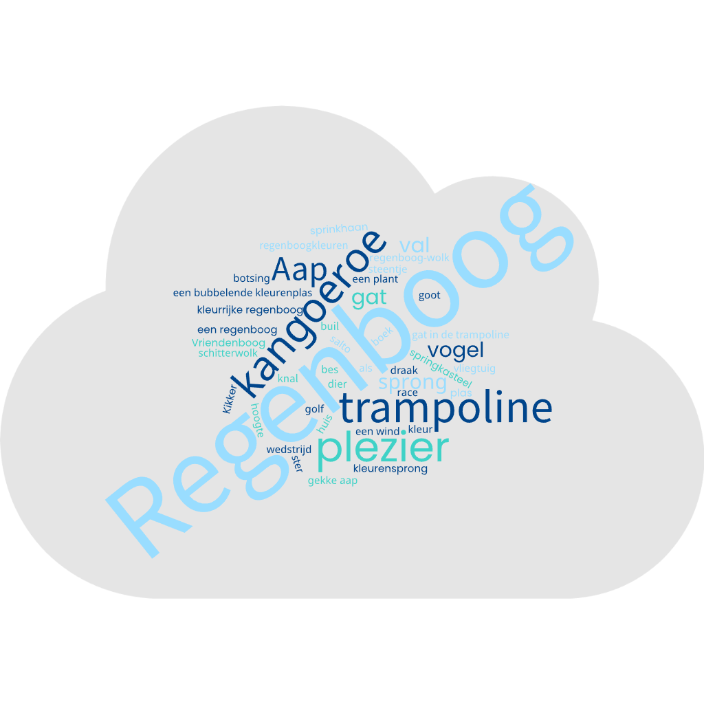 Ook een bubbelende kleurenplas vonden we schitterend. Alsof alle kleuren samen lachen, botsen, mengen en plezier maken. Net zoals kinderen op een trampoline. Want ook dat kwam vaak terug: sprong, salto, hoogte, val… Alleen spring je al ver, maar samen spring je hoger. Dat begrepen jullie helemaal.