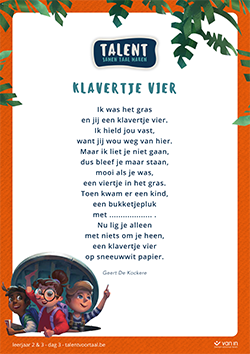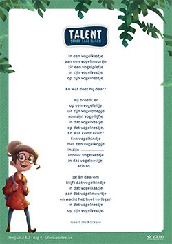 - De link naar de 5 raadselgedichten voor elke schooldag van de Poëzieweek vind je hieronder. De gedichten zijn van de hand van Geert de Kockere (verschillend voor leerjaar 1, leerjaar 2-3 en leerjaar 4-5-6). Druk de poster af en hang hem op in je klas of projecteer het gedicht op je klasbord.