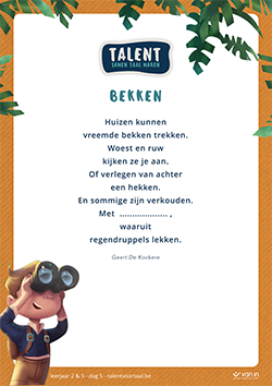 - In elk gedicht ontbreekt 1 woord. Lees en bespreek het gedicht, en denk samen met je leerlingen na over het ontbrekende woord.